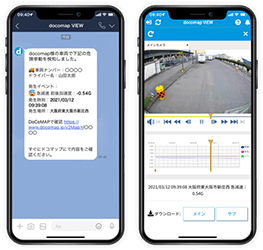 docomapEyeは、急ハンドルや急加減速などの危険挙動を検知時は自動的に前12秒・後8秒の合計20秒の映像と音声をクラウドにアップ。DoCoMAPの画面より、いつでもアップされた動画が確認できます。